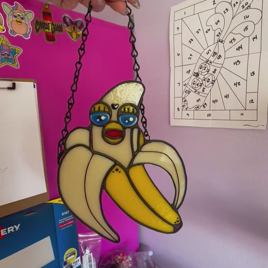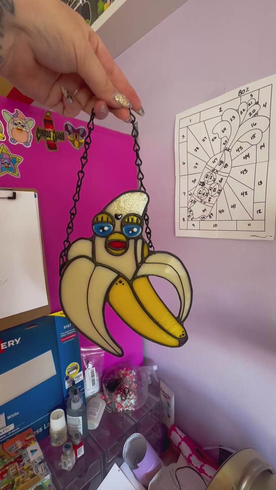 This stained glass piece measures at appx. 8.5" x 7" and comes with a hanging chain.