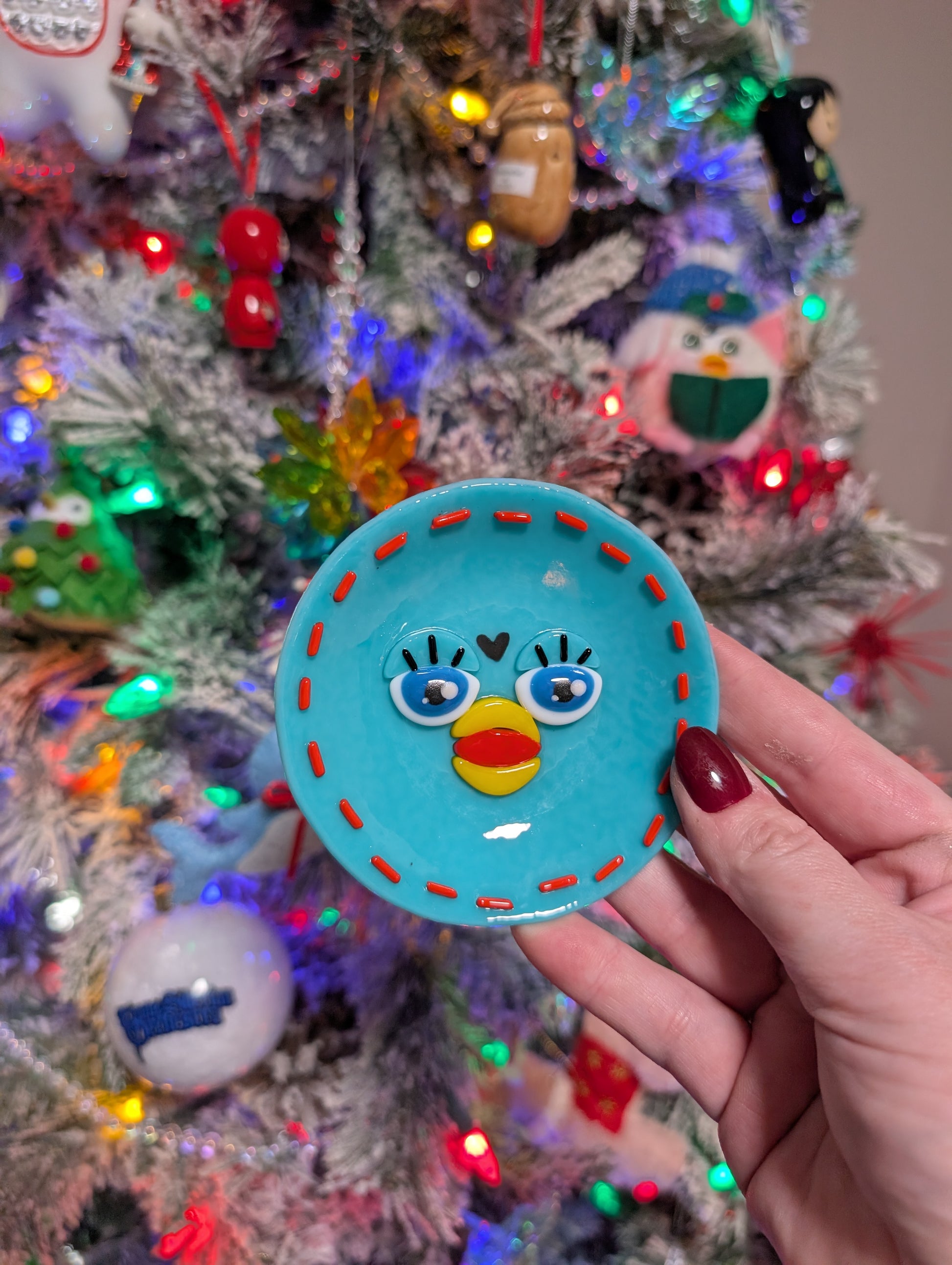 Collect all your trinkets, curios and paper clips with this little furby dish! Made using bullseye glass, stringers and kiln fired paint.