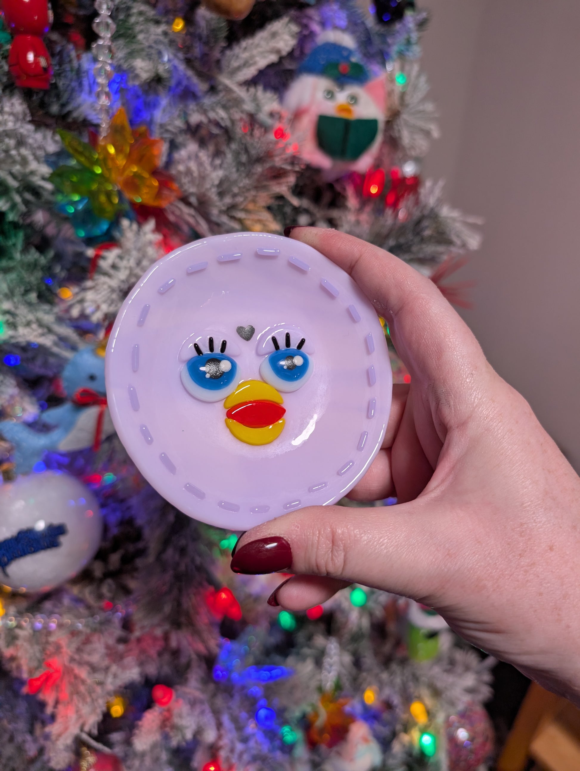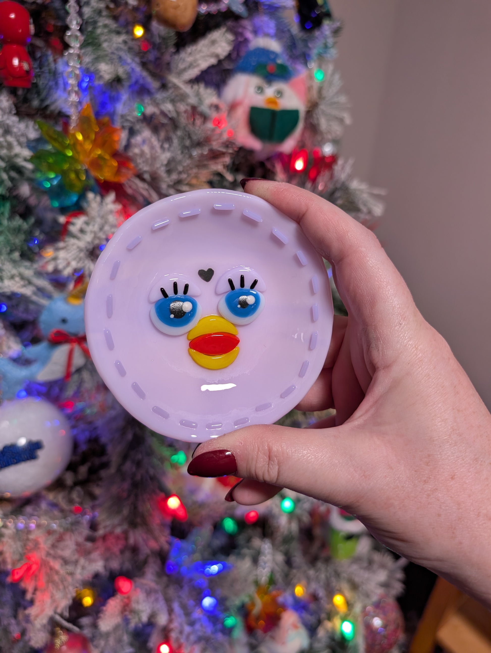 Collect all your trinkets, curios and paper clips with this little furby dish! Made using bullseye glass, stringers and kiln fired paint.