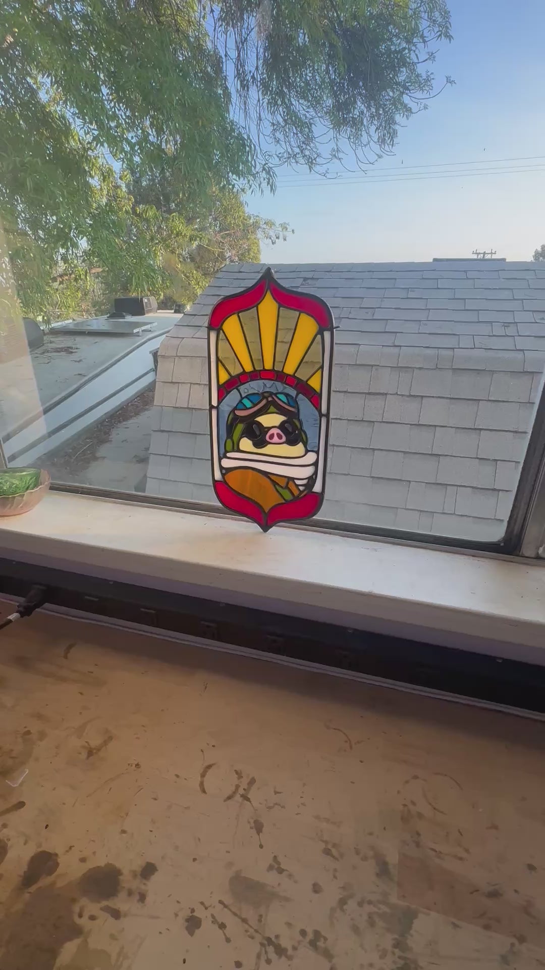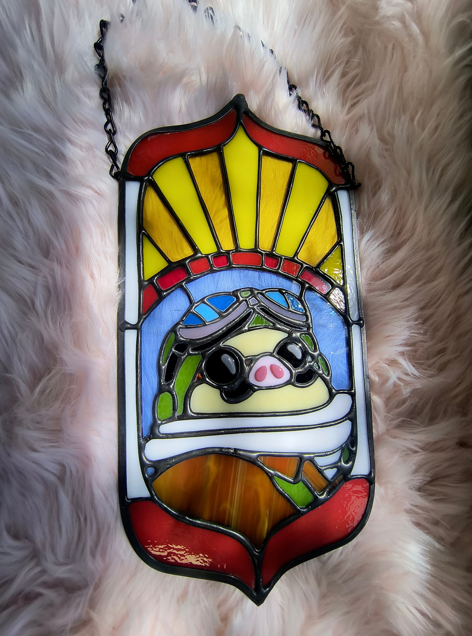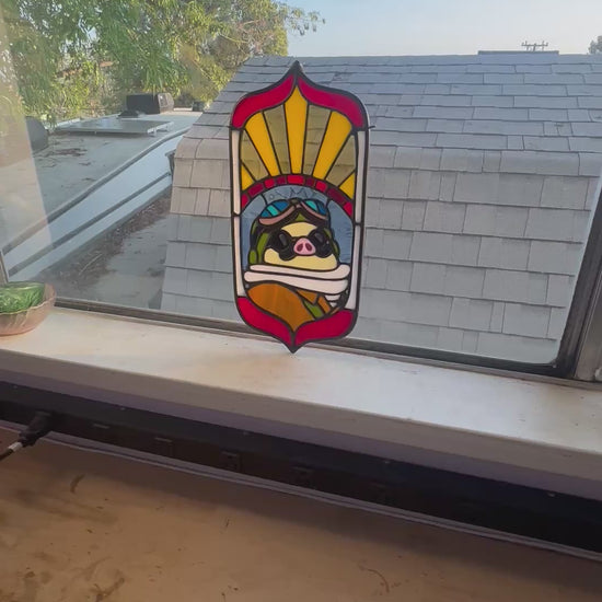 This Porco Rosso stained glass panel measures at appx. 13.5" x 7" and comes with a hanging chain.