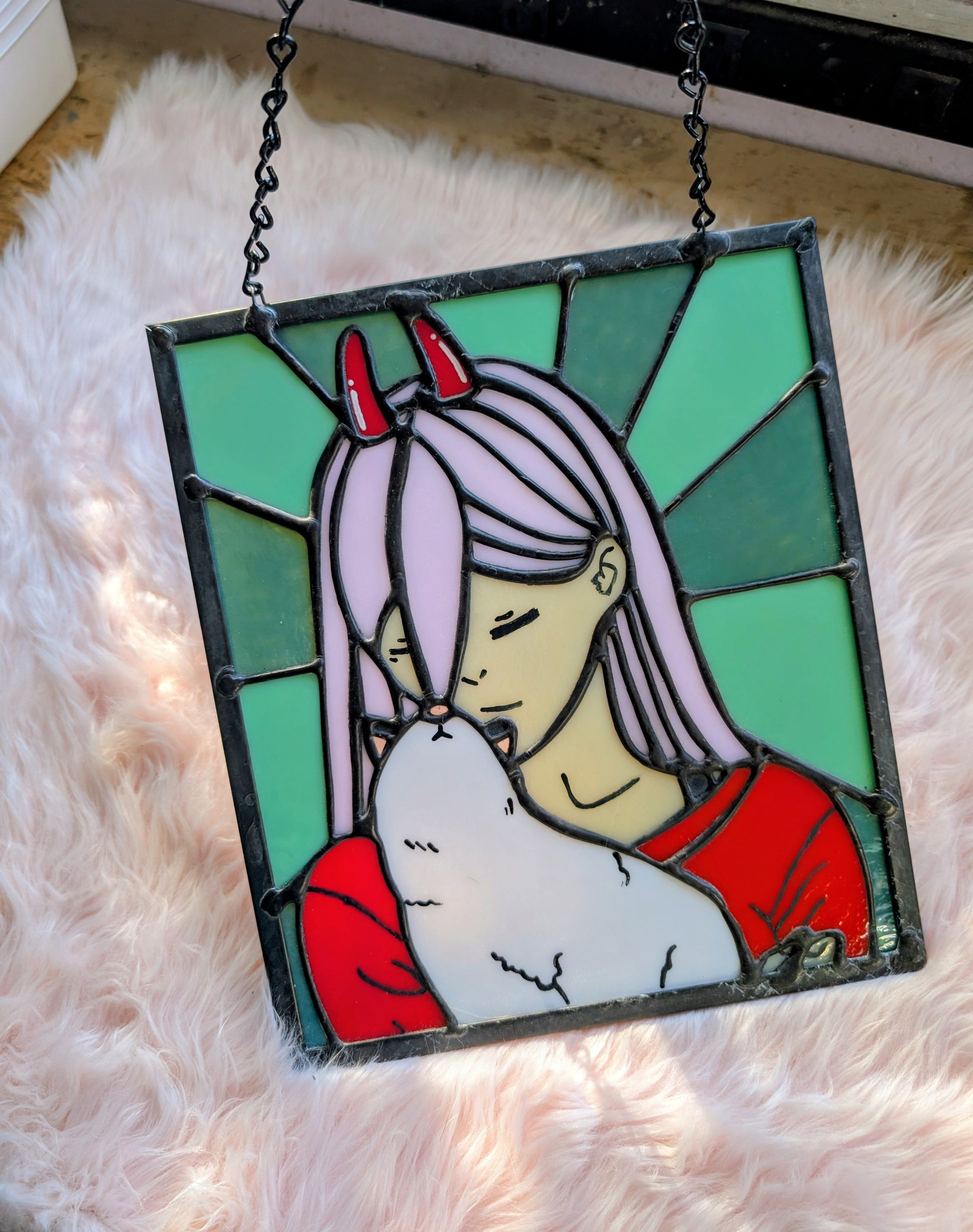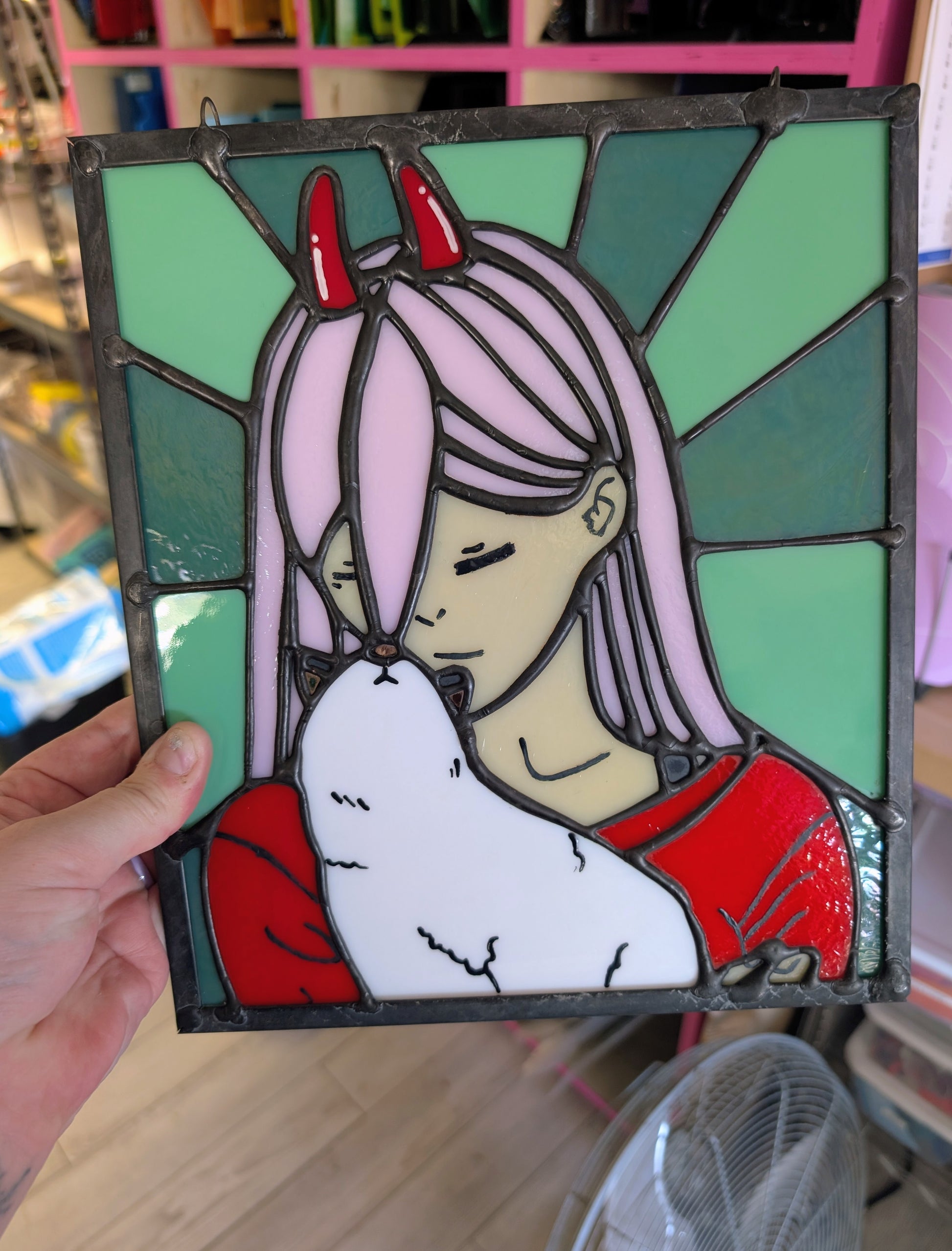 There's no relationship like a demon girl and her Meowy. This panel is inspired by the anime Chainsaw Man. This piece includes hand painted details.