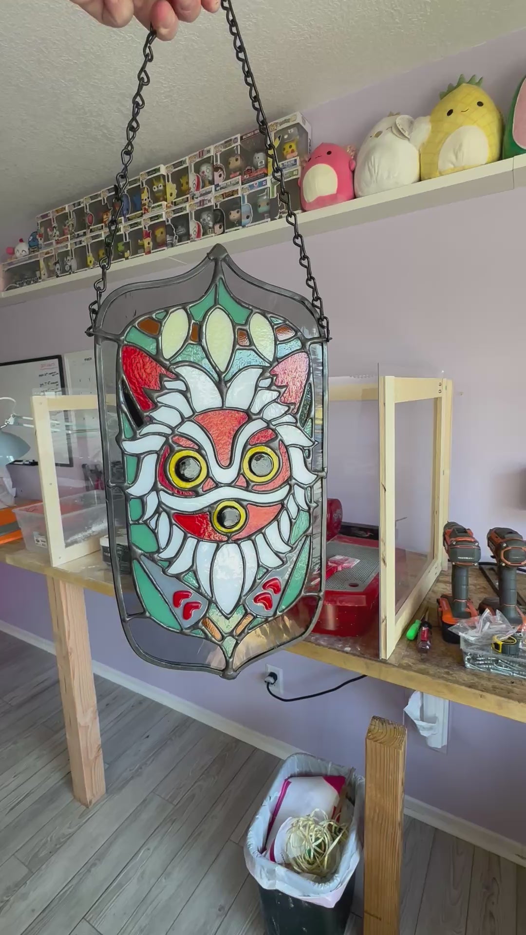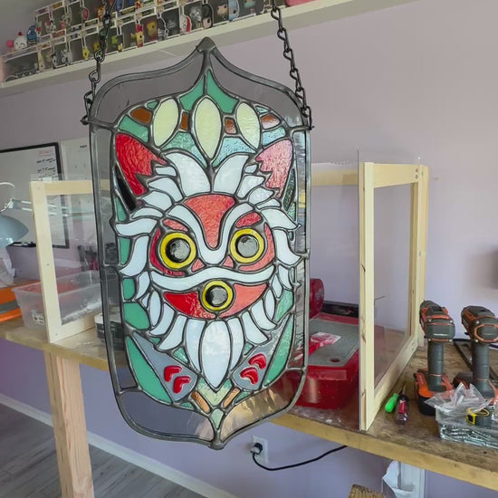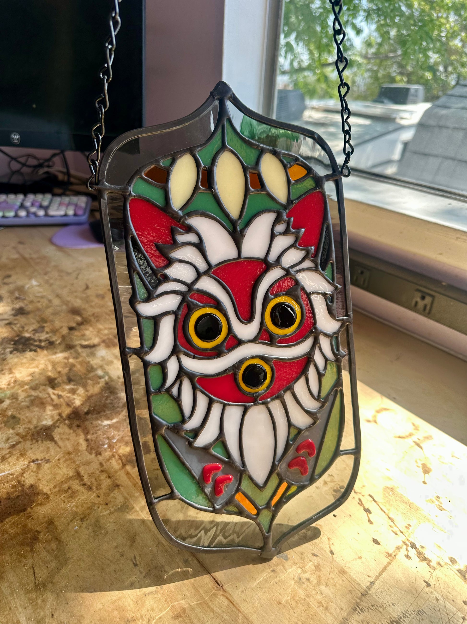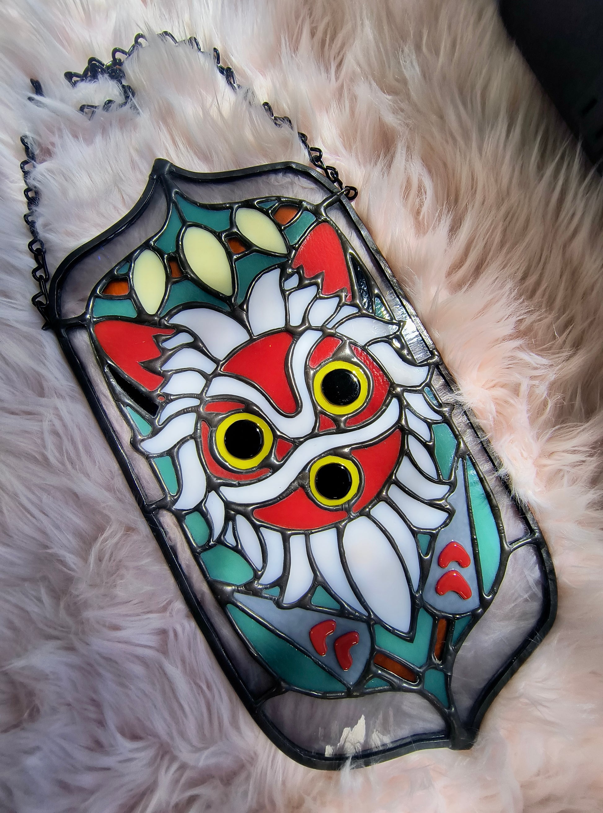 Princess Mononoke mask panel. This piece has fused glass accents and hand painted details.