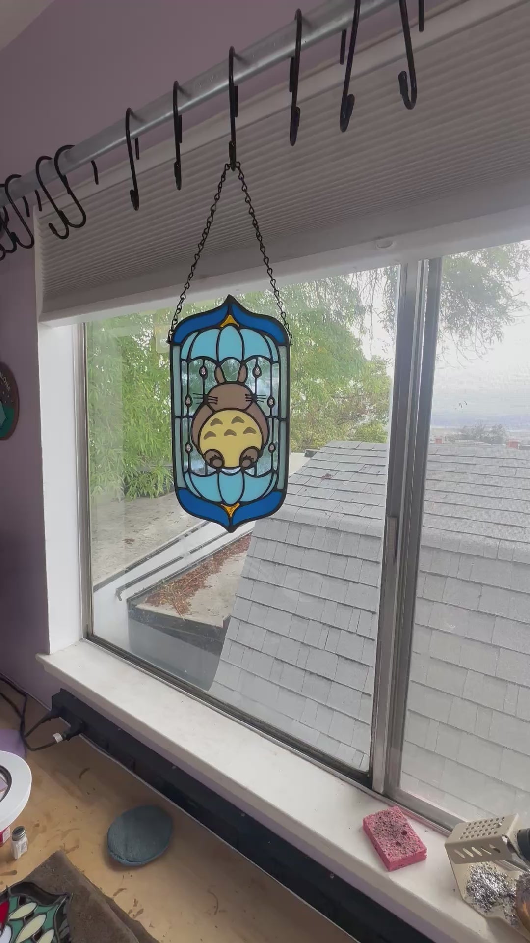 Totoro umbrella panel that comes with shiny little rain drops! This piece has a fused glass belly and wire details.